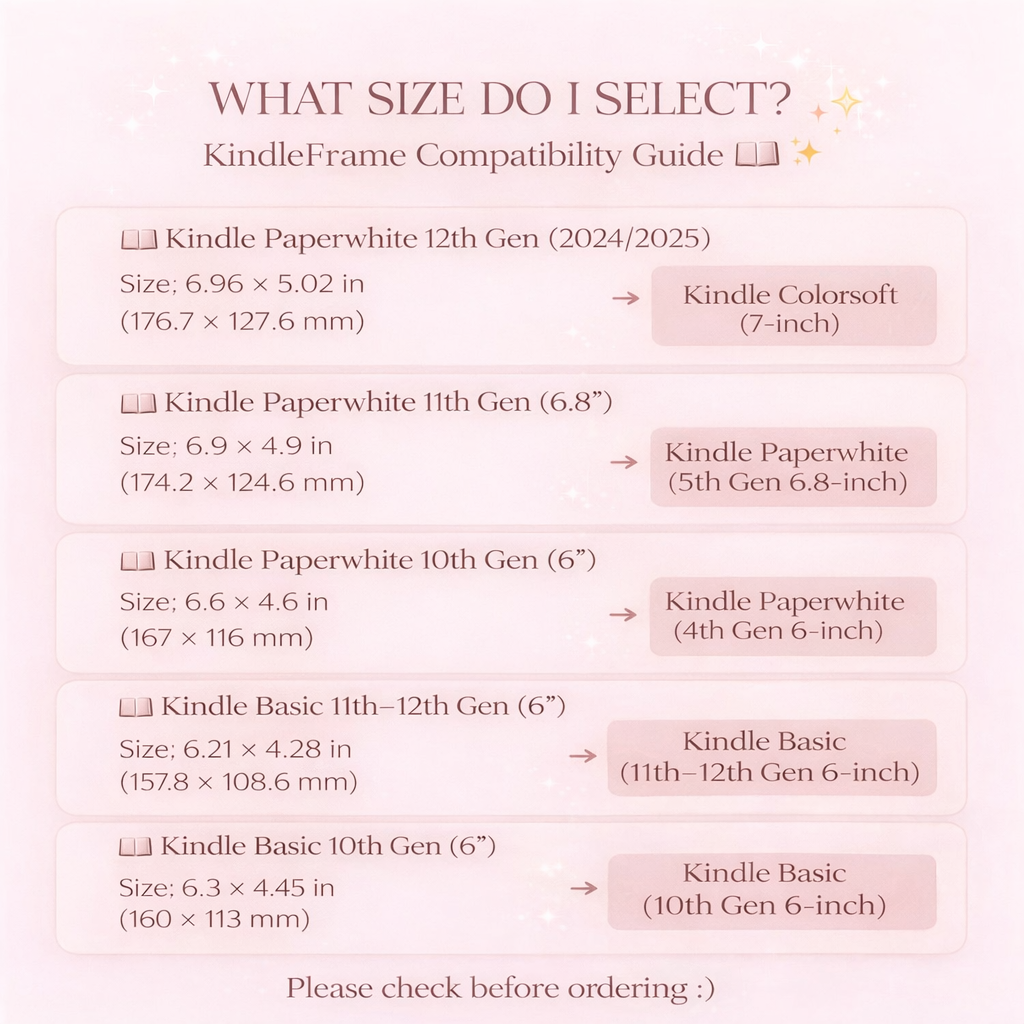 If you’re ever unsure, feel free to message us on Instagram @TheKindleFrame with your exact model number (found in your device settings), and we’ll confirm the correct fit for you 😊